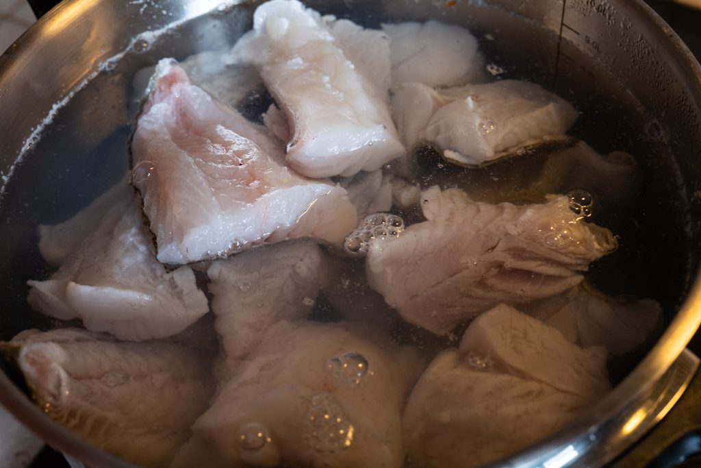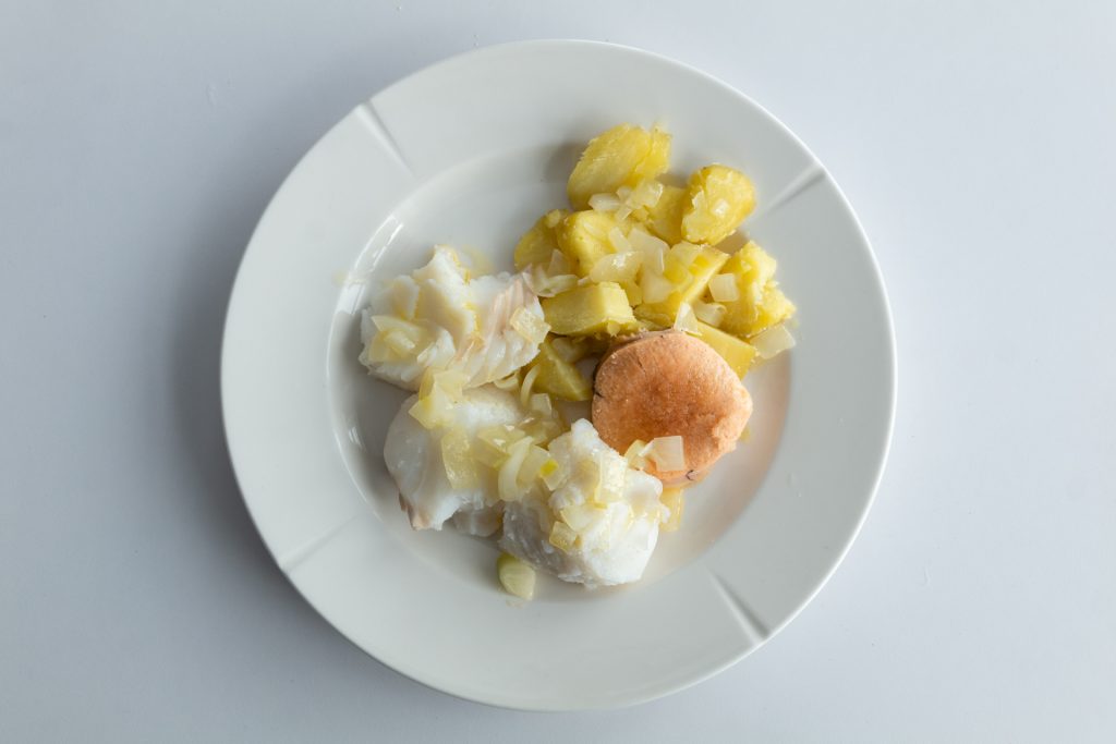 Torsken, som Simon for kort tid siden dro over båtripa, har kommet på kjøkkenbenken. Han skjærer den i rause serveringsstykker, og pakker rogna inn i matpapir. Samtidig som fisken trekker, kutter han løk i småbiter. Denne blandes med smeltet smør. Nå er det bare å koke poteter, og vips så er maten klar.