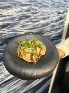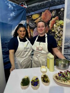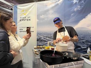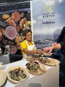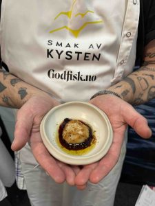 Gjennom to innholdsrike messedager presenterte flere av nettverkets kokker retter som viste hvor variert norsk sjømat kan være. Fra Lola Bistro kom en raffinerte kombinasjon av crudo på kveite med jalapenomajones og ferske urter, FishMe bidro med rene smaker fra havet i form av stillehavsøsters og delikat sashimi med laks fra Austevoll. Alonso og Edwin fra Ostra serverte en nydelig krabbetostada med norske krabber fra Hitramat i møte med meksikansk spice og syrlighet. Fjellskål serverte en perfekt tilberedt breiflabb og silkemyk snøkrabbesalat med hemmelig oppskrift. Med oss på standen hadde vi også venn av Smak av kysten – kokk og influenser Ole Sirnes, som serverte en spennende kamskjellrett med brunet smør og solbær- og ingefærkompott, med lokale kamskjell fra våre medlemmer Scalmarin.